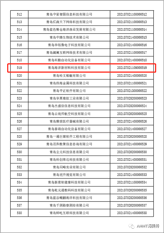 根據《科技型中小企業評價辦法》(國科發政[2017]115號)和《科技型中小企業評價工作指引(試行)》(國科火字[2017]144號)要求,青島海洋新材料科技有限公司經政府有關部門批準入庫成為“科技型中小企業”。這是我公司在提高企業自主創新能力、走創新持續發展道路上取得的又一喜人成果。